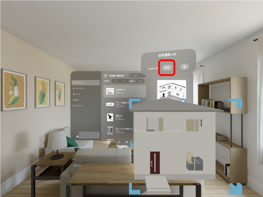 2.[ 原寸 ] ボタンを押すと、原寸大で表示されます ※Apple Vision Proでは3Dモデルを大きく出すことは周りの環境が見えにくくなり、事故や怪我の恐れがあるため推奨されていません。