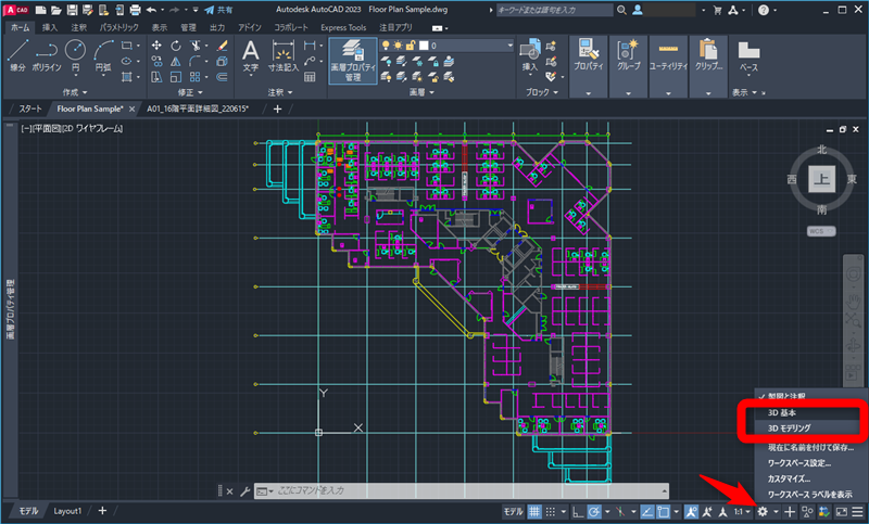 1. 図面を開き、右下の [ ワークスペースの切り替え ] から「3D 基本」もしくは「3Dモデリング」に切り替えます。