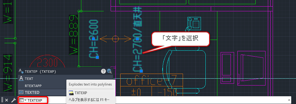 1. 「文字」オブジェクトを選択し、 [ TEXTEXP ] コマンドを実行します。