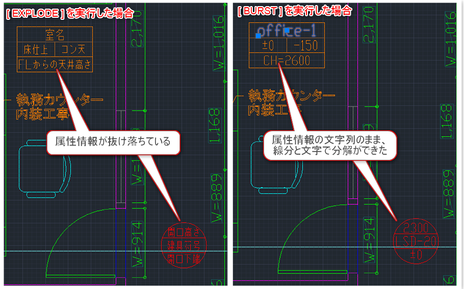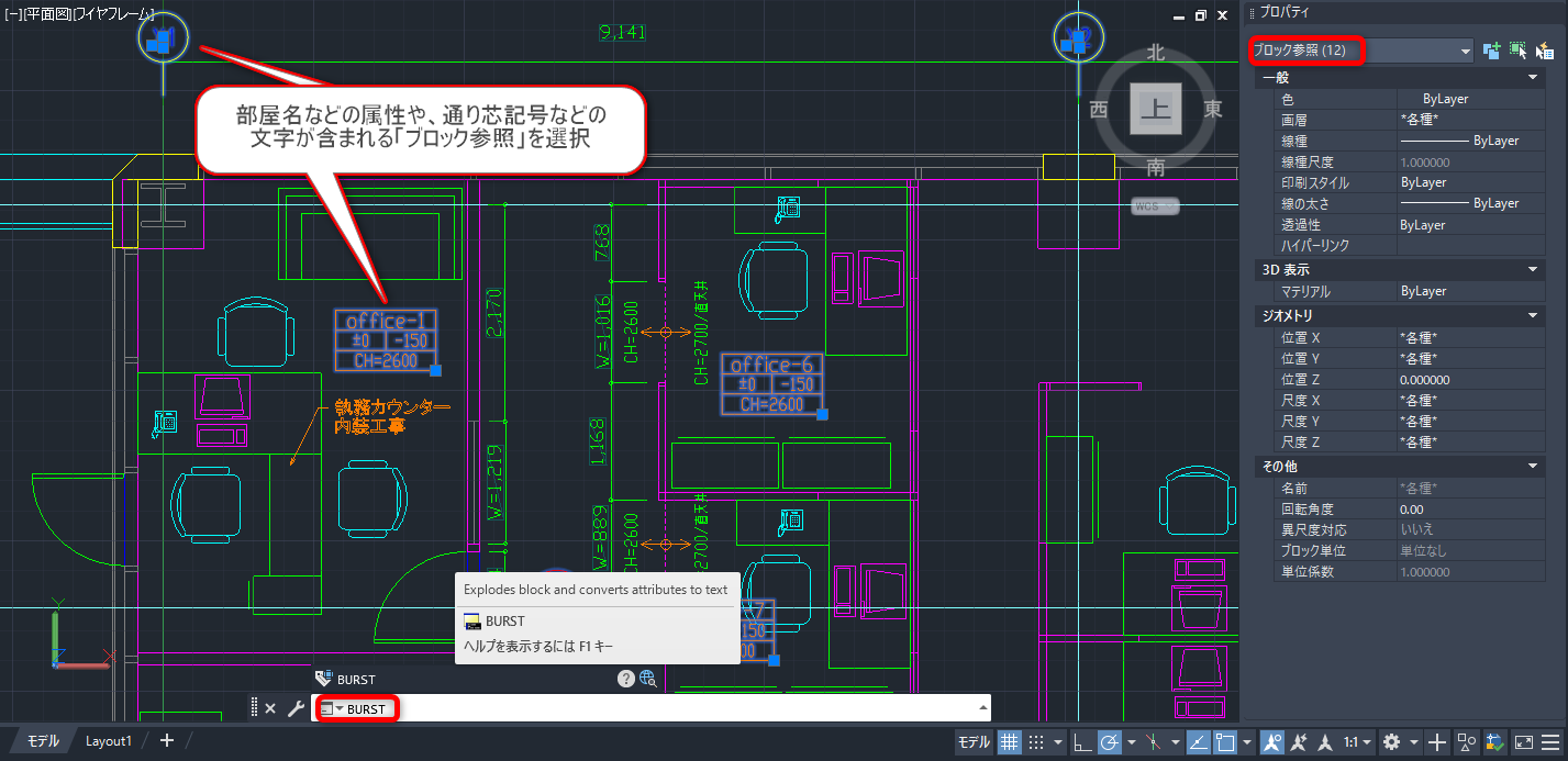 ※ ブロック参照に対して[ EXPLODE ] コマンドを実行してしまうと中に含まれる属性情報が消えてしまうため [ BURST ] コマンドを実行してください。