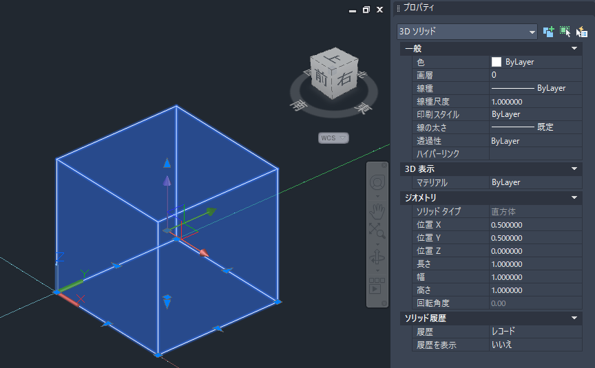 4. これで3Dの.dwgデータの完成です。(今回は原点の位置に1mm角の立方体を配置しました。)