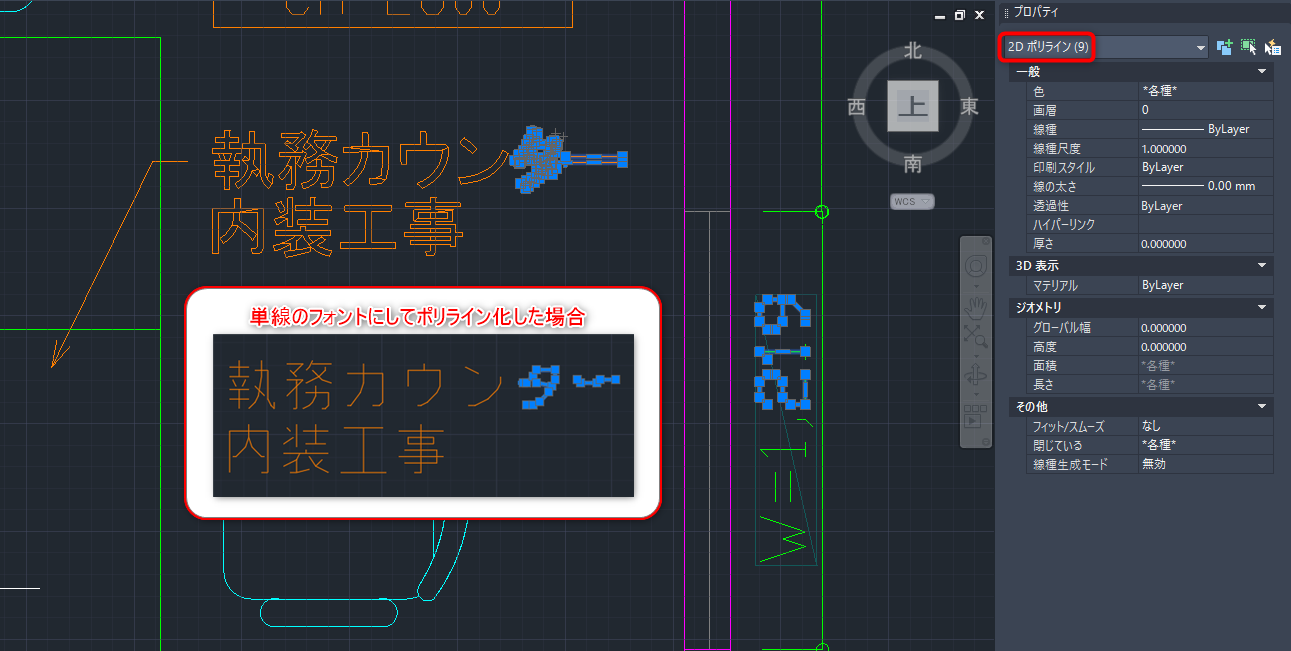 ※太さのあるフォントの場合は文字の輪郭線がポリライン化されるため、生成されたポリラインが複雑になり、データ量が重くなったり、読みにくくなる恐れがあります。あらかじめ単線のフォントを指定しておくと、単線のポリラインになるためデータ量も抑えられ、文字も読みやすくなります。